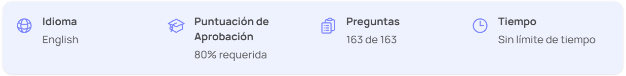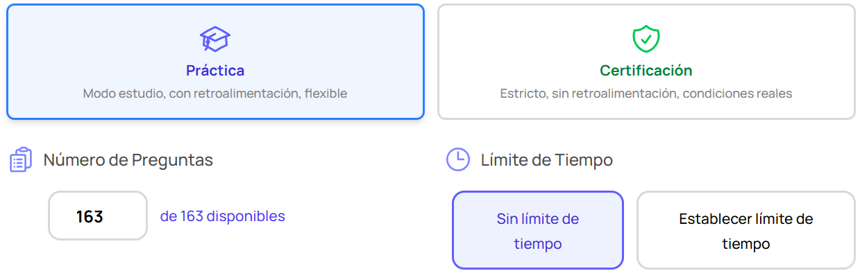 - Modo Certificación: simula el examen oficial, con el mismo número de preguntas y límite de tiempo.