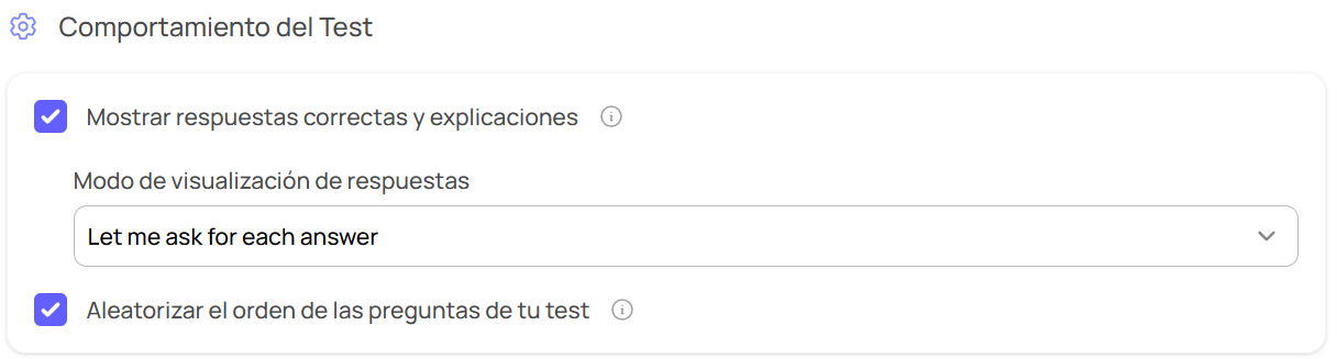 Comportamiento del test: define cómo se muestran las respuestas correctas y las explicaciones, y en qué orden.