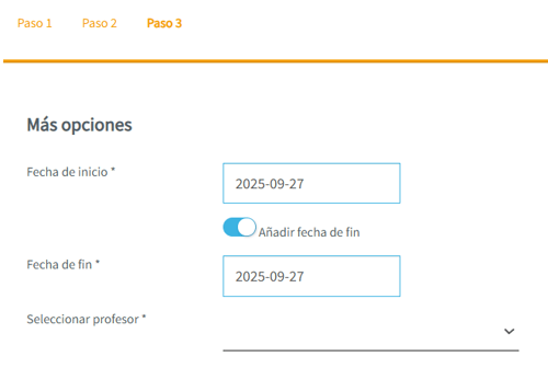 a) Selecciona la fecha de inicio y fecha de finalización del grupob) Haz clic en Seleccionar profesor para asignar el profesor responsable del grupo