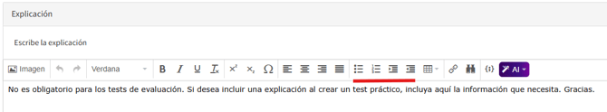 Los campos de enunciado y explicación tienen una barra de herramientas de formato que puedes usar para aplicar formato al texto. Los campos de respuesta tienen un subconjunto de estas opciones. Las principales son: