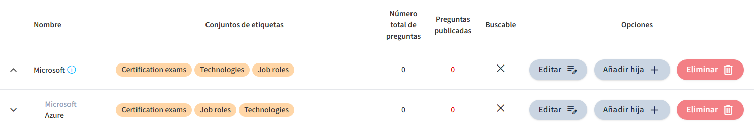 Puedes crear etiquetas principales o etiquetas secundarias. Crear una etiqueta principal permite gestionar el filtrado de preguntas de forma más eficiente, agrupando etiquetas relacionadas bajo una etiqueta de nivel superior. Para gestionar el filtrado de preguntas de manera efectiva, es recomendable crear primero una etiqueta principal.