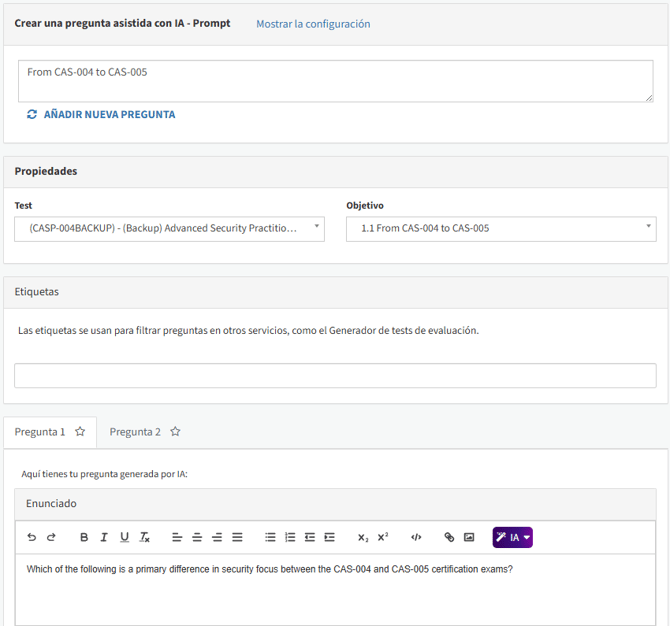 Serás llevado a la pantalla de creación de preguntas asistidas por IA, en la que podrás: