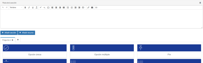 - Pregunta 1 (y botón +): selecciona el tipo de pregunta que deseas añadir al caso de estudio. Puedes añadir tantos tipos de preguntas como necesites.