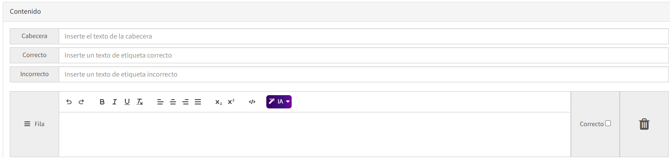 - Fila: escribe el texto que aparecerá en las celdas de respuesta (filas) y marca aquellas que sean correctas. Puedes añadir más filas haciendo clic en + Añadir fila.