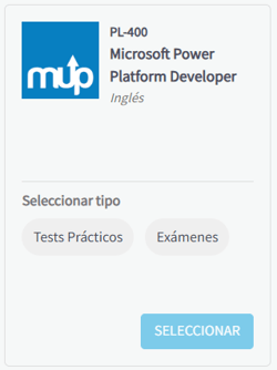 6) Una vez localizado el producto, selecciona el Tipo a usar (Tests prácticos o Exámenes) y haz clic en SELECCIONAR.