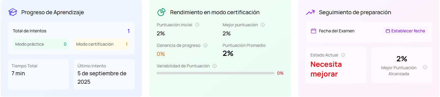 Seguimiento de preparación: Refleja tu nivel de preparación en relación con el examen oficial de certificación.