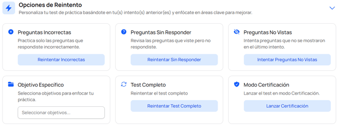 Importante: Los intentos en los tests de práctica son ilimitados mientras el test esté activo. Se recomienda a los estudiantes aprovechar esta flexibilidad para reforzar el aprendizaje y ganar confianza antes del examen real. |