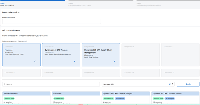 4) Escribe el nombre de la evaluación para tu test.5) Busca y selecciona las competencias que deseas incluir en tu evaluación.