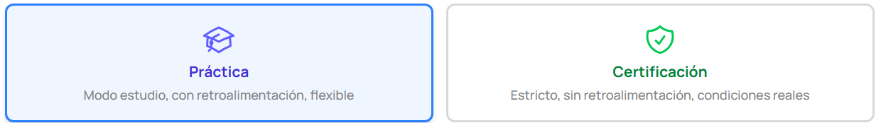 1) Lanzar en modo Certificación. Este modo simula el examen real y sirve como herramienta de diagnóstico para evaluar el nivel inicial del estudiante. También proporciona una base para seguir el progreso a lo largo del tiempo.