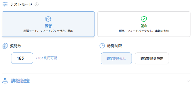 - 認定モード。本番試験の環境を再現したモードです。