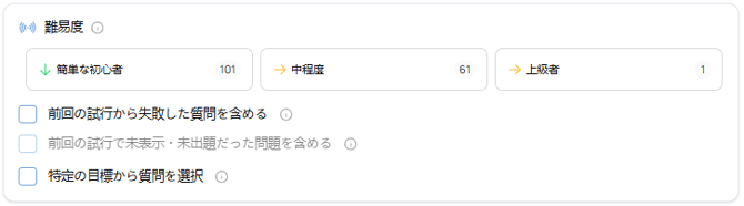 次の基準で質問を絞り込んで受験できます: