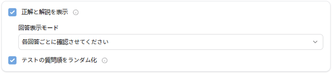 正解や解説の表示方法、質問の順番などを設定できます。