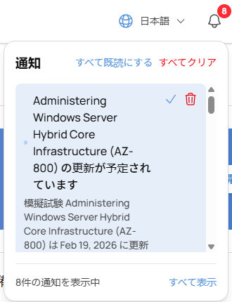 MeasureUp Learn の通知パネルを使って、製品アップデート、技術的なお知らせ、アカウント関連情報を常に把握しましょう。