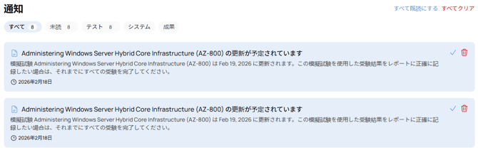MeasureUp Learn では、タイムリーな技術的アラートや製品情報を受け取るための 通知機能 を提供しています。この機能を利用することで、最新の更新、新製品のリリース、そして MeasureUp アカウントに関するその他の重要な情報を常に確認できます。