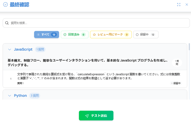 - テストサマリー:回答済み、レビュー対象、未回答のステータスを一覧で表示