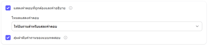 พฤติกรรมของแบบทดสอบ: กำหนดวิธีการแสดงคำตอบที่ถูกต้องและคำอธิบาย รวมถึงลำดับการแสดงผล