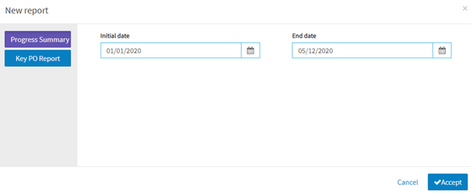 เลือกประเภทของรายงาน: Progress Summary (เทมเพลตสำเร็จรูป) Key PO Report (รายงานเปล่า)