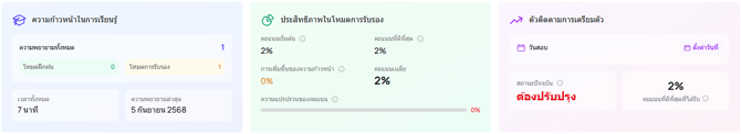 - สรุปคำถาม: จำนวนคำถามที่ตอบถูก, ผิด และยังไม่ได้ตอบ (คลิกที่แต่ละช่องเพื่อกรองคำถามตามสถานะในส่วนวัตถุประสงค์)
