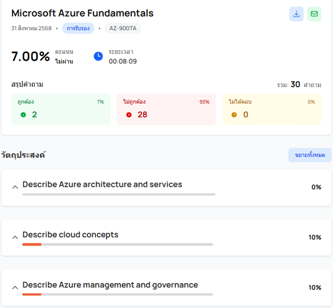 - สรุปคำถาม: จำนวนคำถามที่ตอบถูก, ผิด และยังไม่ได้ตอบ (คลิกที่แต่ละช่องเพื่อกรองคำถามตามสถานะในส่วนวัตถุประสงค์)