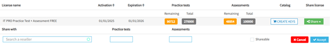 ข้อสำคัญ: หากคุณต้องการแก้ไขไลเซนส์ที่แชร์ไปแล้ว ให้คลิกที่ไอคอน EDIT ซึ่งอยู่ทางด้านขวา หากต้องการสร้างการแชร์ไลเซนส์ใหม่ สำหรับองค์กรที่คุณเคยแชร์ไลเซนส์ให้แล้ว หรือสำหรับองค์กรใหม่ ให้ทำตามขั้นตอนดังนี้: 1) คลิก + Share with another organization2) กรอกข้อมูลในช่อง Share with, Practice tests และ Assessments 3) คลิก Accept |