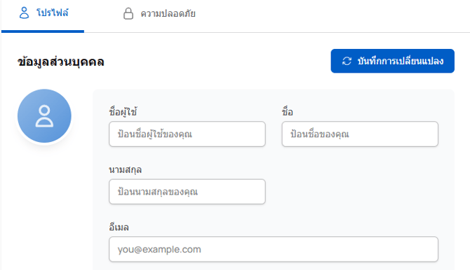 - โปรไฟล์: อัปเดตชื่อผู้ใช้, ชื่อจริง, นามสกุล, อีเมล และรูปโปรไฟล์