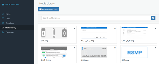 Media Library จะเก็บไฟล์ทั้งหมดที่สามารถเพิ่มเข้าไปในคำถามได้ เช่น รูปภาพ (Exhibit) หรือคำตอบ (base image และ answers) รูปภาพจะถูกจัดเก็บโดยอัตโนมัติ และจึงสามารถใช้ในหลายคำถามได้