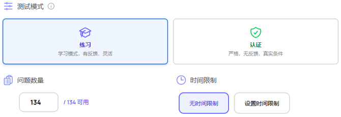 - 认证模式:旨在模拟官方认证考试,包括与真实考试相同的问题数量和时间限制。
