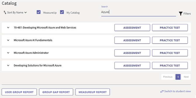 您可以设置产品目录,然后选择哪些模拟考试或评估对组织成员可用。当您通过 Microsoft Teams 访问 MeasureUp 应用时,您将能够看到 MeasureUp 目录中的所有产品或您自己的目录:
