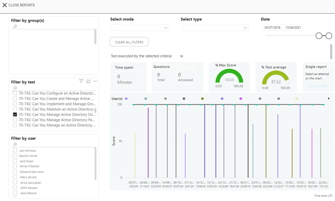 要查看分组的个人报告,请点击 用户组报告 (USER GROUP REPORT),然后您可以按组、测试或用户筛选结果
